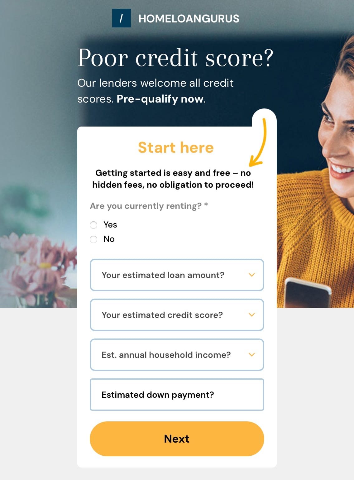 Let’s set the stage with what was tripping up HomeLoanGurus’ form: The original design, while functional, presented a cluttered layout that could overwhelm visitors. Users might have felt a higher cognitive load with multiple fields displayed closely together, leading to hesitation or abandonment. This setup, while common, left room for improvement in creating a smoother, more user-friendly experience.