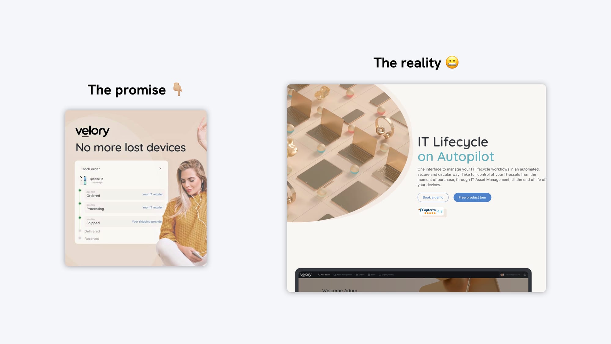 ✅ Fix: Lead with the problem you solve. Keep the “no more lost devices” message consistent through the hero section. Clarity and continuity always prevail over cleverness.