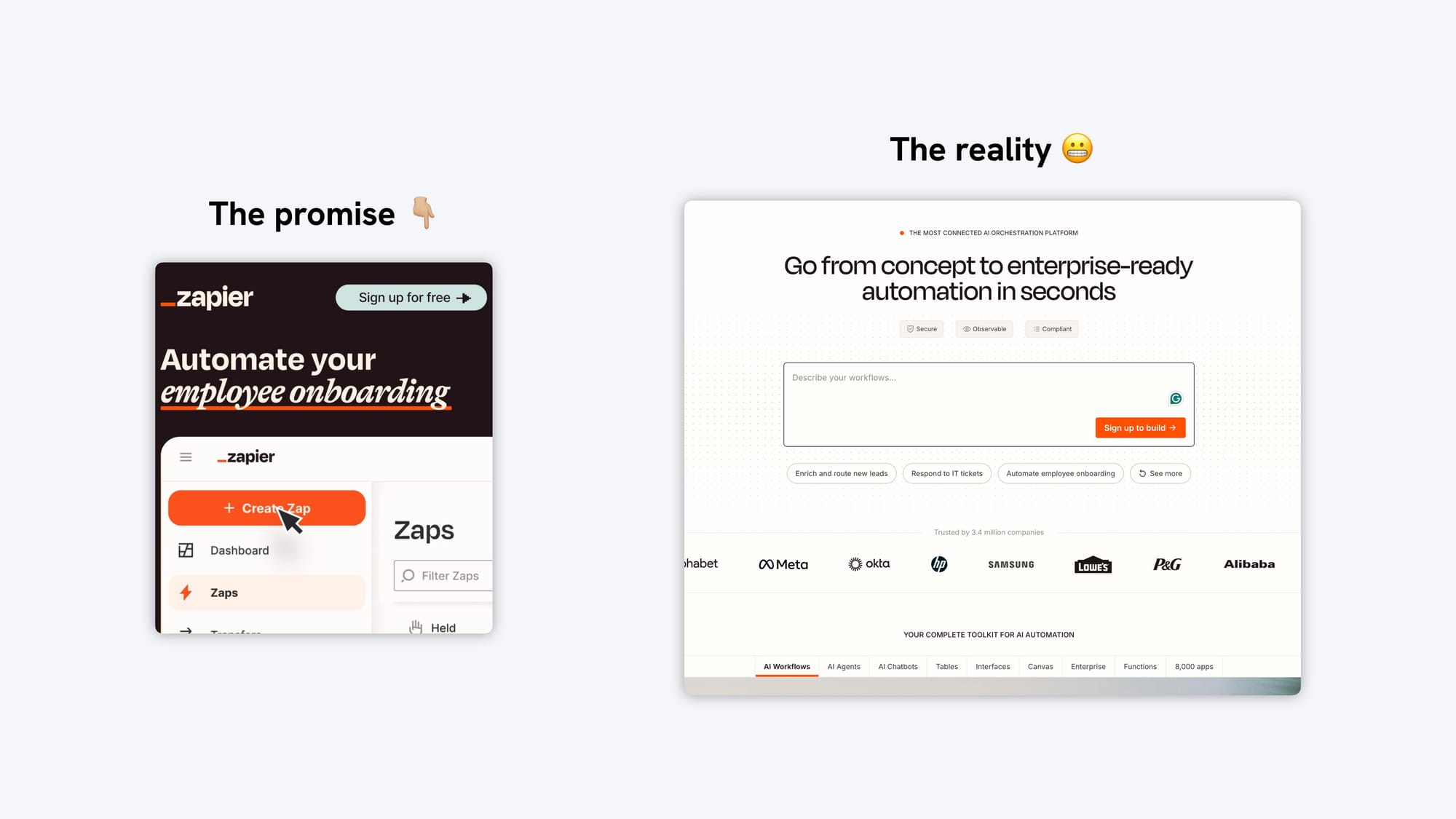 The reality: “Go from concept to enterprise-ready automation in seconds.”